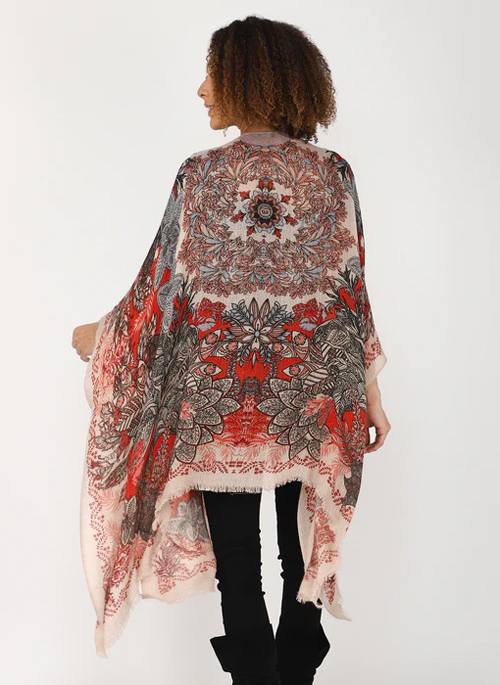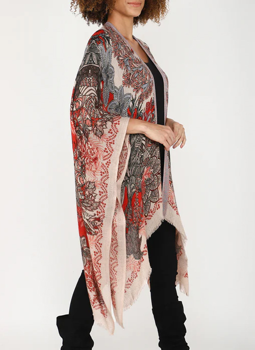 This dynamic kimono features an ornate paisley print and a fabrication that lends itself perfectly to the season. This topper will keep you cozy while feeling lightweight. Featuring a longer, sharkbite hem, this kimono can be worn with casual looks of jeans or leggings or as a topper for your favorite cocktail dresses.