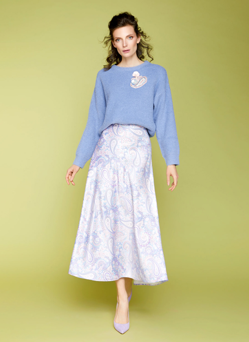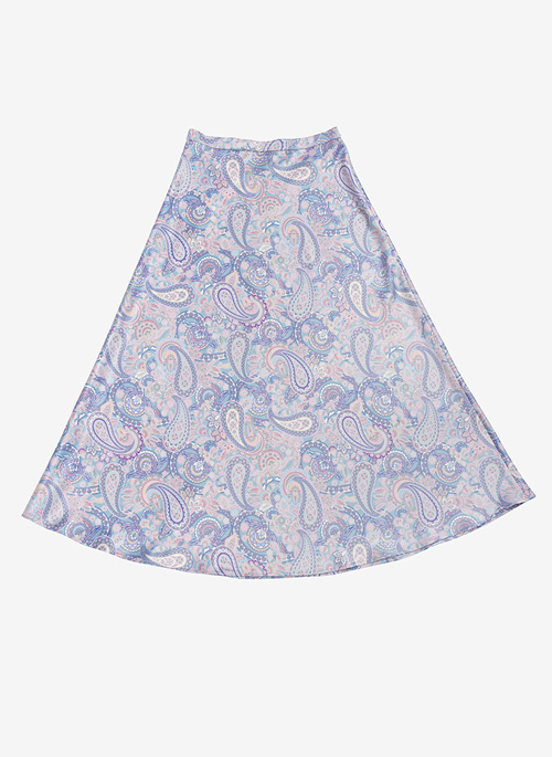 High-waist satin skirt with beautiful paisley print. It has A-line shape, length above the ankle and invisible side zip fastening.