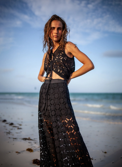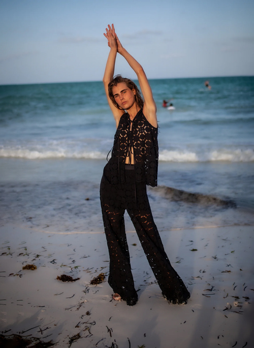 Our Pamela pants in this intricate black doily lace are an instant beach-chic classic. As with all our Pamela pants, the high waistline is flattering and the wide legs have a fantastic drape that swooshes with every step. Wear them sans lining and over your bikini on the sand or with the shorts lining and our matching Tula tie top for a sultry summer night out.