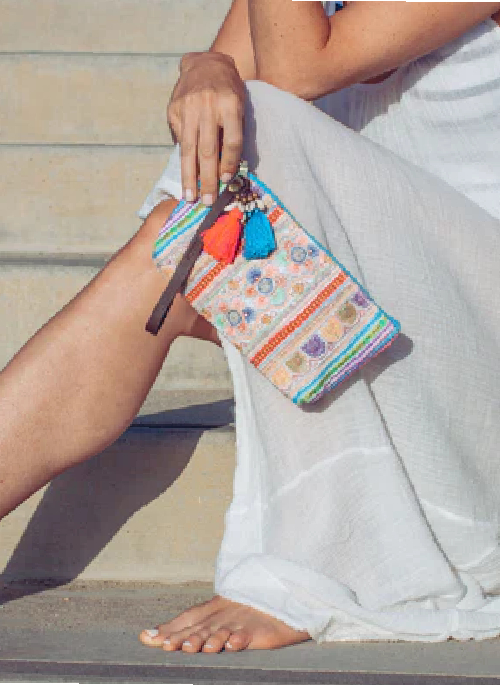 One-of-a-kind hand-embroidered wristlet clutch with puka shell tassel charm. Ultra suede lining and interior zip pocket.