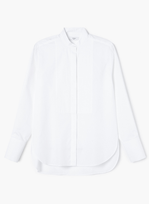 Cotton-poplin loose shirt button-down silhouette, long sleeves, buttoned cuffs, small stand collar with hidden-button closure and pleated bib front.Details: