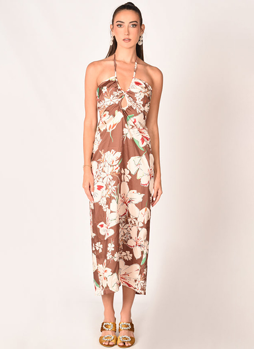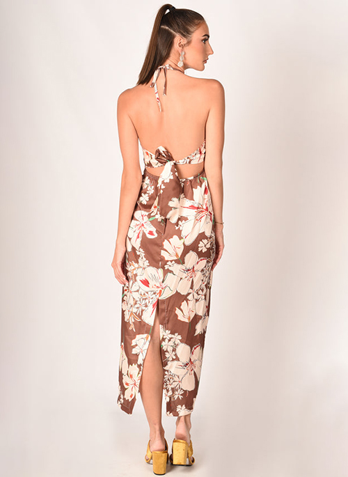 Long dress with halter neck and open back with floral print. Perfect dress for a summer evening or day.