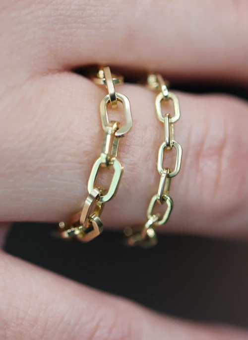 A bolder version of our 14k yellow gold paper clip chain ring! It can be worn alone or stacked with other rings. It's flexible like a mini bracelet. 4mm wide links.