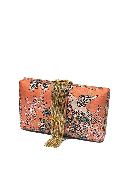 - Peach colored cruelty free silk clutch with hanging gold tassels on the front and back flap