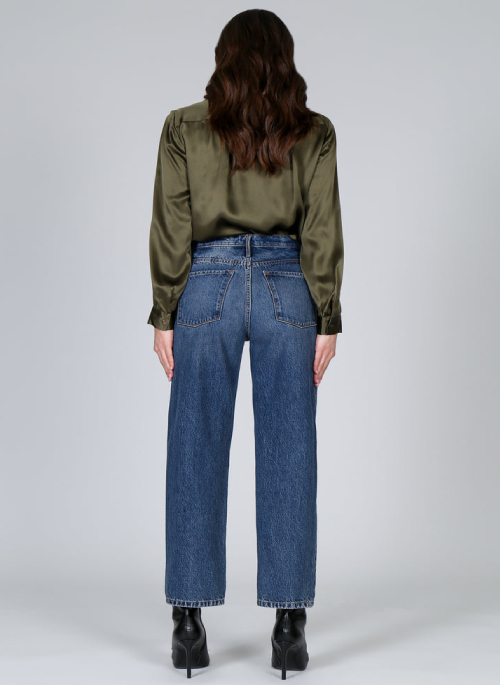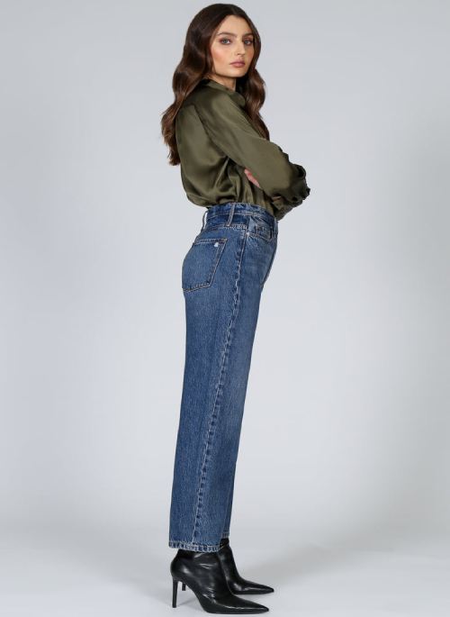 I can't leave now. A high-rise straight-leg pair of jeans with a button fly and a finished hem. Cut from our Vintage Rehab fabric to provide a 90's inspired fit and a soft feel, In Too Deep is a dark blue wash with whiskering and light sanding on the thighs.