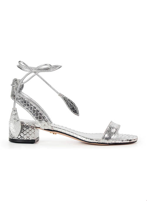 The Paula Sandal is made of leather with a filleted texture and features a glossy finish, adding sophistication to the piece. Its classic design includes a slightly rounded toe and a block heel. The sandal is completed with an ankle tie closure, and its leaf-shaped tip adds a touch of romance to the piece.