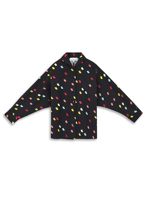 A stretchy, fitted sailor top with a buttoned front in a simple print of bright coloured butterflies. She looks great with the matching skirt or plain trouser.