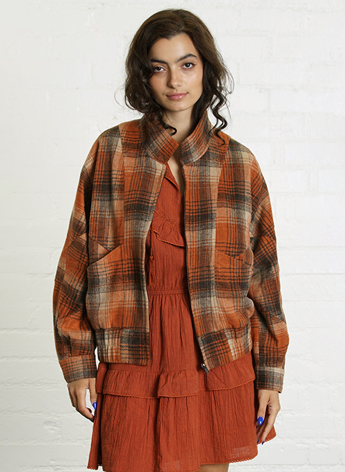 Cut in a deep orange, muted dark brown and cream colored Brushed Plaid, the Paulina jacket—with its relaxed silhouette and smocked band.