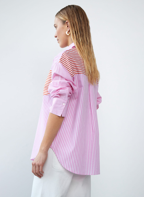 Beautiful oversized shirt in a beautiful stripe mix, button-through front with chest pocket and high/low effect at the bottom. Long sleeves with cuff and button detail at sleeve opening. The gorgeous patch-work shirt is a fresh creative take on a shirt classic. The shirt is made from a beautiful soft cotton quality, giving the shirt great comfort while avoiding creases and long hours with the iron. At StyleStore.com, we believe in the small luxury wardrobe, composed of the best materials, in versatile silhouettes that you can wear season after season, all available at prices that make sense. Model is 173 cm and wears a size small.The shirt is true to size, and you should go with the size you normally wear in tops and blouses. #Betterwardrobe.