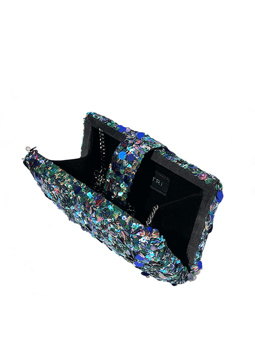 - Multi shaped & colored sequins hand embroidered clutch with a magnetic belt flap as closure