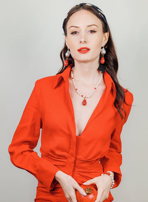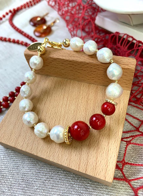 This handmade bracelet is made of freshwater pearl, coral, and Japanese gold plated brass findings. It's pretty, brilliant, and can be worn from day to night. Match with our Farra Coral earrings and necklace to complete your look.