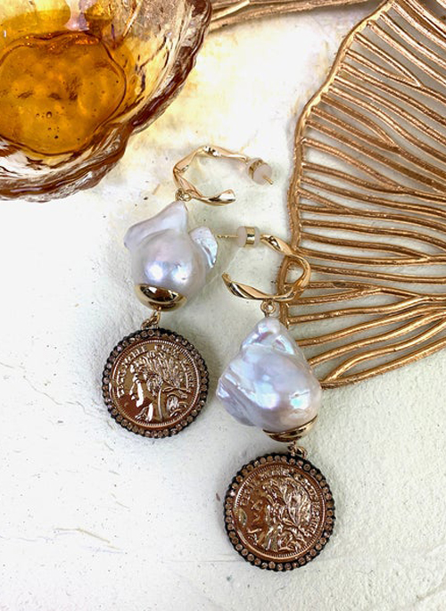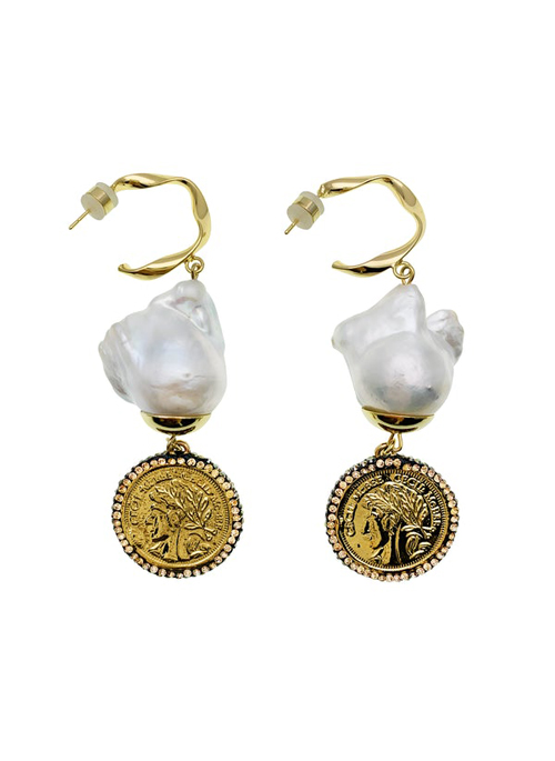 This pair of beautiful earrings are made of baroque pearl with a coin charm and Japanese gold plated brass findings. Every piece of baroque is unique with an irregular non-spherical shape. Match with our Farra necklace and a straw hat to complete your look.