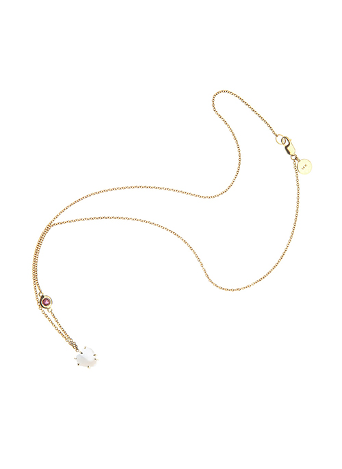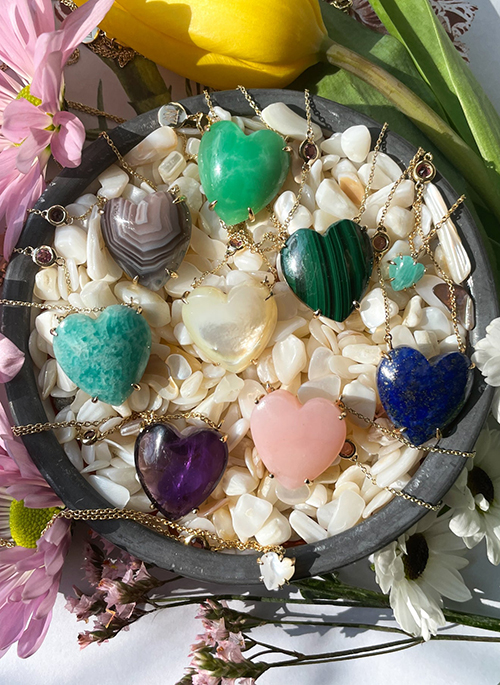 NEW! Beautifully hand-carved mother of pearl heart, set in 14k gold and accented with a petite bezel set pink tourmaline. We love this piece for the incredible claw-prong setting. Delicate and special with a bit of edge.
