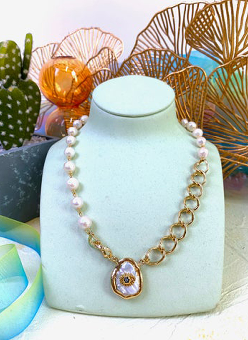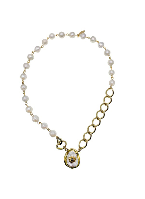 This handmade necklace is made of freshwater pearls with an evil eye charm and Japanese gold plated brass findings. It's beautiful and stylish. Match with a blouse, a dress, or knitwear, and wear our Farra earrings from the same collection to complete your look! It can be worn from day to night for any occasion.