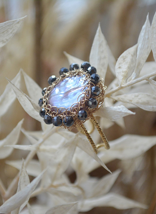 The flower-like ring has been constructed artfully with crocheted 14K Recycled Gold filled wire and playfully strung dozen of mini faceted Terahertz stones around a lustrous baroque freshwater pearl. Terahertz stone represents the ‘Radiation of Life’. It has understated elegance, and marries well with any occasion and outfit.