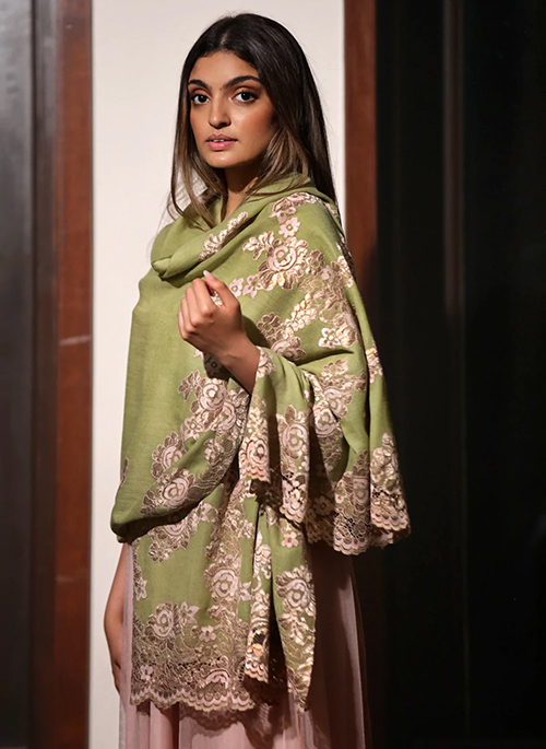 Woven from a fine cashmere, this fern green scarf features an exotic light copper and pink chantilly lace application extending at the ends of the scarf. A unique and stunning evening wear accessory to elevate the look of any outfit.