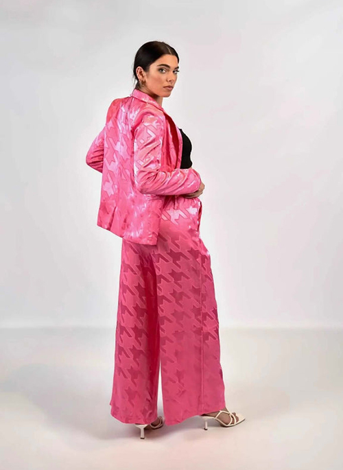 Tailored essential for the modern woman, made in a vivacious and lively pattern. This blazer combines masculine and feminine elements of tailoring to create a contemporary piece. The large buttons are made of the same fabric to create a cohesive aesthetic and let the vivid color and elegant print be the highlight. Boot cut pants for perfect pairing.