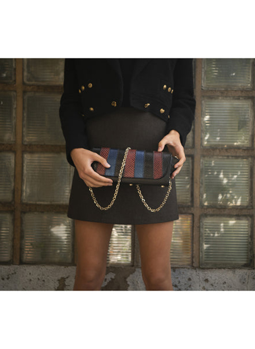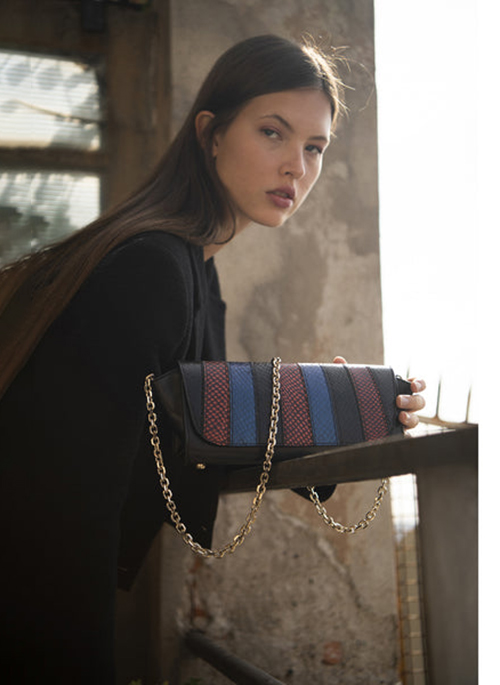 Straight out of the 90s, Thalie’s Pernille is made of recycled marine leather and is finished with a stripped salmon patchwork design on flap. This baguette bag will prove spacious enough to hold all your must-haves. Wear over shoulder or detach removable metal gourmet chain strap to carry in hand.