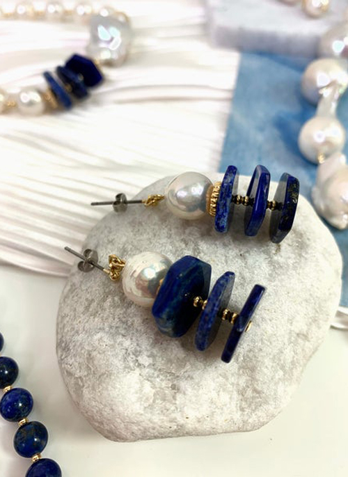 These handmade earrings are made of lapis lazuli stones with freshwater pearls and Japanese gold plated brass findings. It can be worn with a dress, blouse, or denim from day to night for any occasion. Matching with our Farra lapis necklace and a straw hat to complete your look!