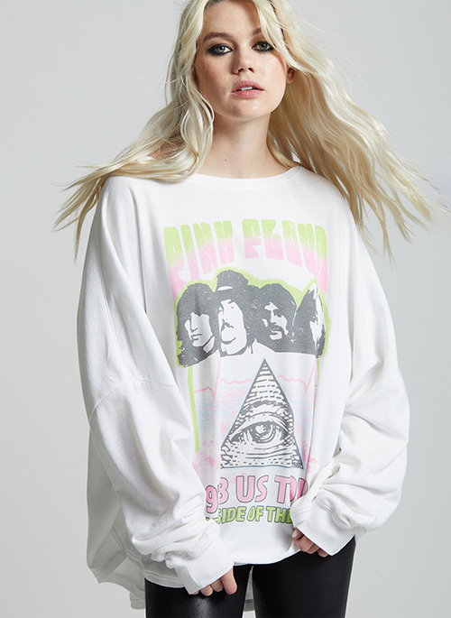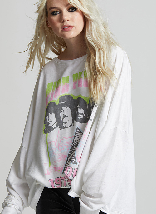 Explore the "dark side" with Pink Floyd in this vintage style tour sweatshirt. "The Dark Side Of The Moon" is Pink Floyd's eighth studio album, and was released in 1973. Our super soft sweatshirt features vivid pink and green graphics from their 1973 US Tour in support of the album. Made with vintage washed fabric, a loose crew neckline, long sleeves, and a high low hem.