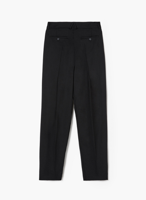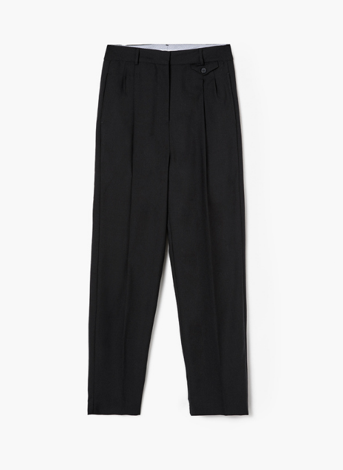 Wool straight leg trousers with front pleats, two-seam pockets, one coin pocket and two jetted pockets. Knee-length lining and striped poplin waistband.Details: