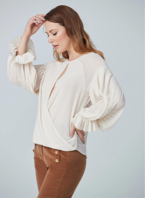 This long sleeve pleated blouse with a chest opening exudes romance and elegance. Perfect for your office looks or an evening out.