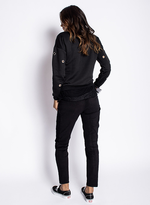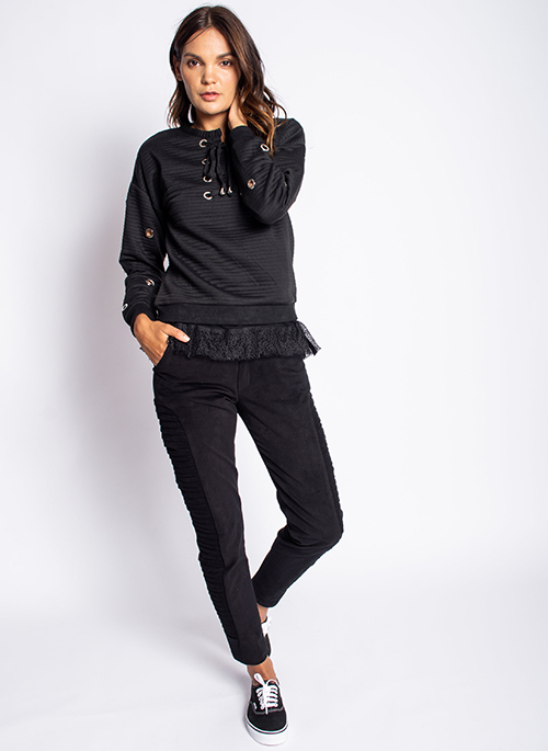 - Pleated panel at both legs