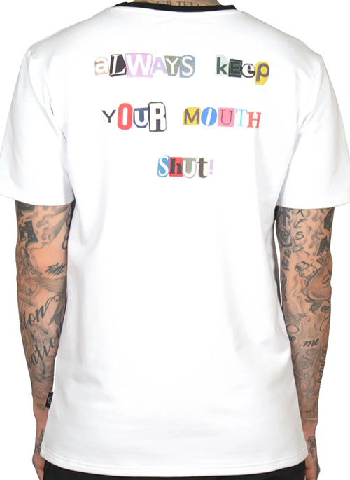Never Rat On Your Friends. Always Keep Youth Shut. When the pocket is closed the rat is caught in the trap and when it is open the rat is grabbing the cheese.