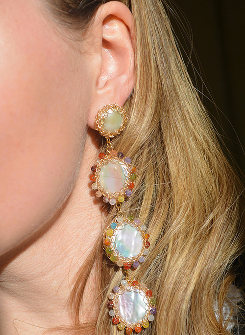 The lace-like statement drop earrings are constructed artfully with crocheted recycled 14K gold-filled wire and playfully strung dozen of mini multicolored cubic zirconia around a lustrous baroque freshwater pearl.