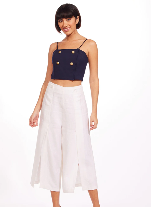Set sail with this cute nautical-inspired crop top with gold button details that pairs perfectly with this season's wide leg pant trend!