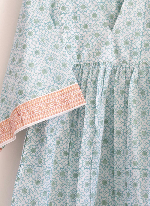 Soft slightly sheer cotton block printed with our modern graphic floral print that reminds us of poppies.  There's a contrasting color trim to bring the dress a little pop. The dress is generous and fits many shapes. It has a V neck yoke top trimmed with hand embroidered detail, drop shoulder with butterfly sleeves. We’ve also added pockets. Perfect for lounging around the house, walking around town, and fits comfortably in one’s suitcase as you venture off to some sunny location.