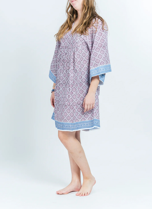 Soft slightly sheer cotton block printed with our modern graphic floral print that reminds us of poppies. There's a contrasting color trim to bring the dress a little pop. The dress is generous and fits many shapes. It has a V neck yoke top trimmed with hand embroidered detail, drop shoulder with butterfly sleeves. We’ve also added pockets. Perfect for lounging around the house, walking around town, and fits comfortably in one’s suitcase as you venture off to some sunny location.