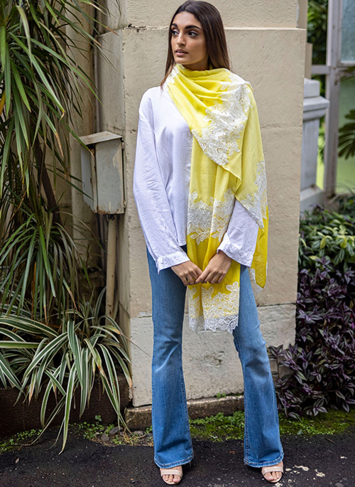 This chic lemon yellow ombre scarf, crafted from a very soft silk and wool blend, features bands of contrasting Ivory Chantilly lace cutouts. Comfortably warm and stylish, this scarf can be worn in multiple ways and will always elevate the look of any outfit.