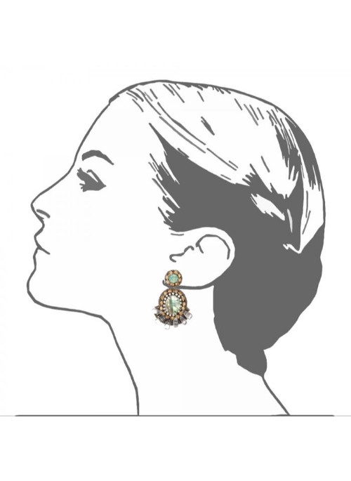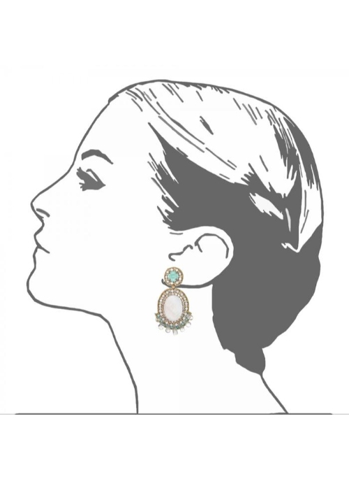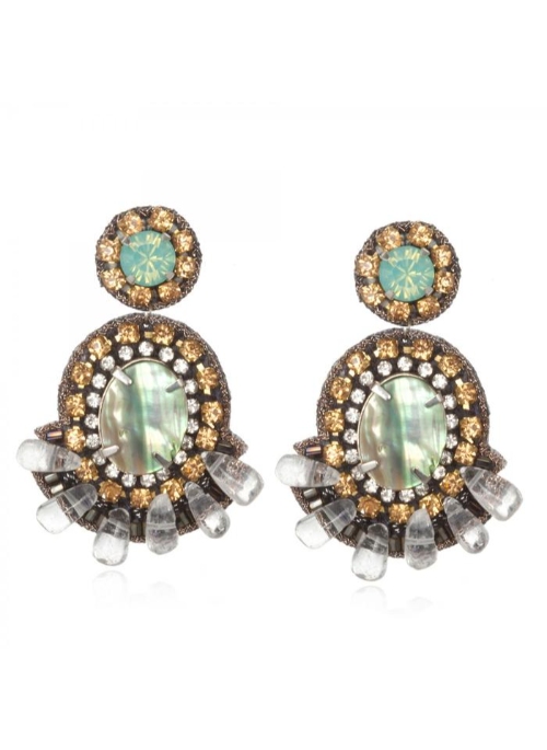 Drop earrings are made of round resin pronged gems and oval pronged shell beads, outlined in rhinestone chains and seed beads.