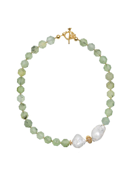 This handmade necklace is made of natural Prehnite with beautiful baroque pearl with Japanese gold plated brass findings. Every piece of baroque is unique with an irregular non-spherical shape. This necklace can be worn from day to night for any occasion, match it with our Farra earrings to complete your look!