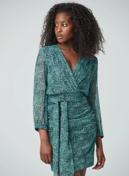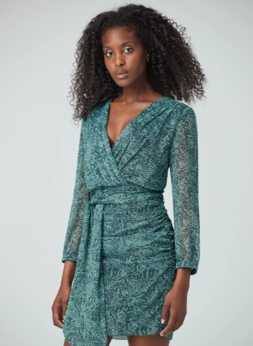 Short V-neck dress with buckle belt at the waist that fits the body and gives a little stretch at the waist. A romantic and elegant dress that wears well with long or short boots according to your preference. The print chosen for this dress in a timeless that goes well with everything. The jade color is perfect to start the fall season.