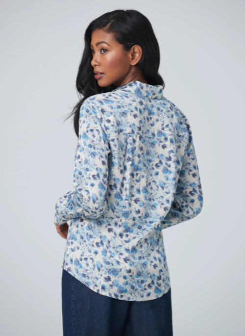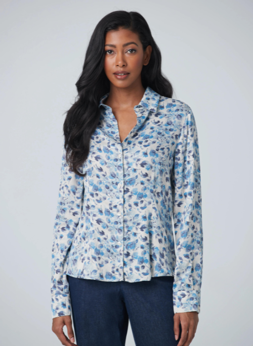 Floral printed blouse in different shades of blue made from a fabric imported from Italie. A rich and elegant print to complete every look. A loose blouse that looks great with skinny jeans or straight high waisted pants.