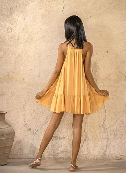 Simple yet glamorous is how this flirty, tiered mini dress is best described. The front keyhole has beautiful fabric artwork made by hand and with influences from the African textile heritage. Lined with a thin cotton voile lining, always keeping comfort and summer breeze in mind.