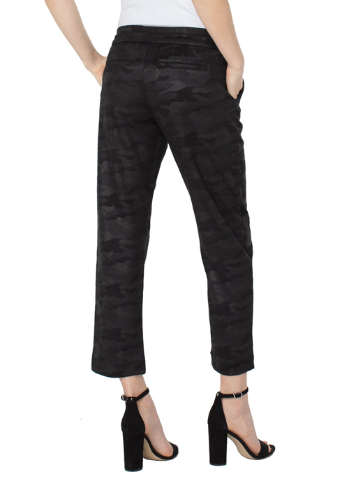 Our pull-on knit trouser is perfect for all day comfort while still looking fabulous. Featuring a subtle black camo print, this trouser is great for work or out on the town! Pairs beautifully with a casual top and sneakers or dress it up with a sleeveless blouse and heels. Make it a set and pair it with the matching jacket for a great all-in-one look!