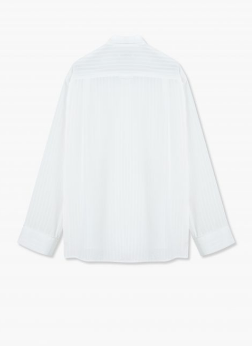 Loose-fit, long-sleeved white-on-white stripes Tencel shirt with one chest patch pocket with a monogramming embroidery. Cuffs with matching piping and buttoned front with a button-loop under its point collar. This product was mindfully upcycled from deadstock fabric that would have otherwise gone to waste.Details: