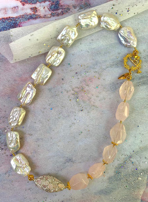This handmade necklace is made of rectangular freshwater pearls, rose quartz, rhinestones bordering rose quartz, and Japanese gold plated brass findings. It's feminine, pretty, and can match with a floral print top, midi dress, or knitwear. Match with our Farra rose quartz earrings to complete your look.
