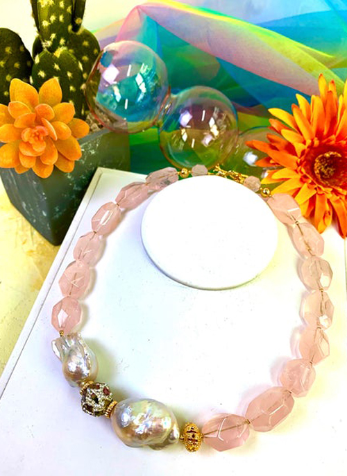 This handmade short necklace is made of natural rose quartz, baroque pearl with rhinestones bordered tourmaline, and Japanese gold plated findings. Wear it with a floral print or a square-cut neckline top!