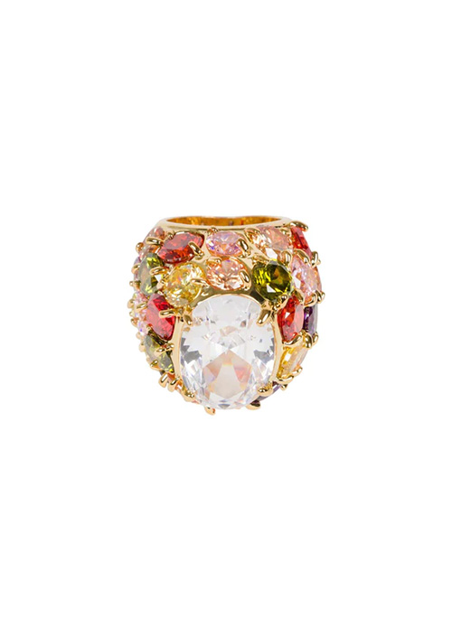 This ring is gold plated with large, prong-set, rainbow rhinestones surrounding the oversized oval center crystal stone.