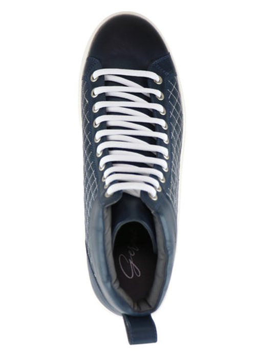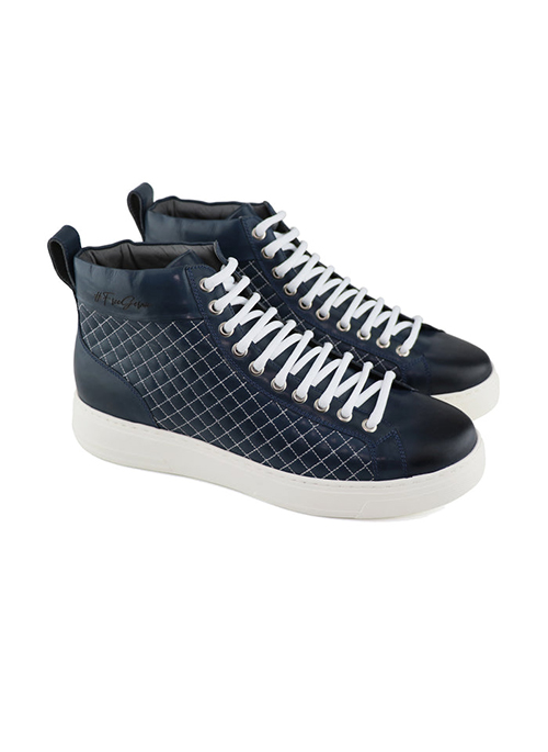 The 52's high in midnight blue are crafted with premium Napa leather and finished with a distinct quilted design. This classic shoe style is a fine sneaker that can be combined with any attire, from street casual to high-end fashion. The handcrafted 52 Collection designer sneaker features a padded and removable footbed for optimal comfort, adjustable lace, and a treaded rubber sole for excellent traction. Our chunky high sneaker is designed in New York City and precisely stitched by skilled artisans in Brazil.