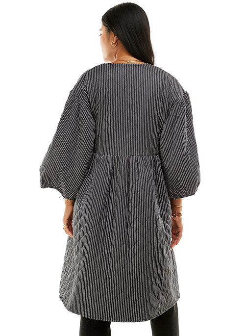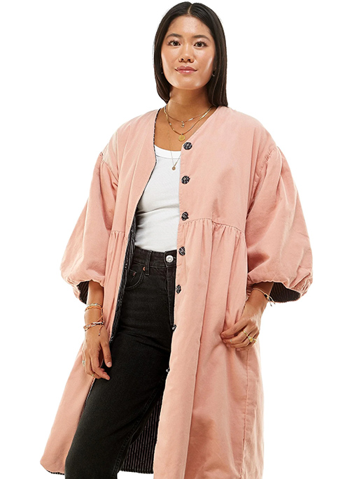 Just in time for layering season! The Corkill Jacket is a little cool, a little sweet.. reversible function quilted jacket with drop shoulder puff sleeves. Relaxed and roomie fit including side pockets. Contrast snap front button closure. Model is wearing size SMALL.