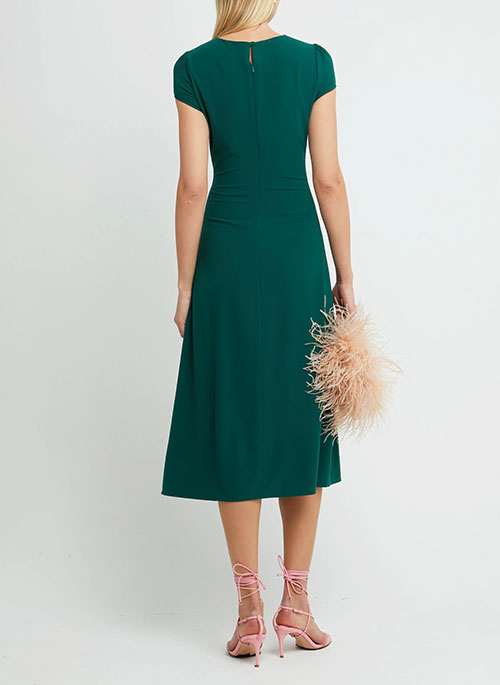 Sleek and chic, this form fitting dress features flattering ruching on the body and faux button details up the side.
