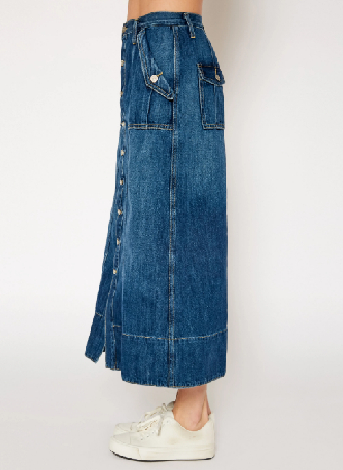 Designed with functional features, this utility maxi skirt easily transitions from day to night. It features two side pockets to hold all your items, and a front opening that adds a unique charm to the design.