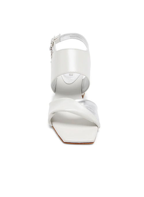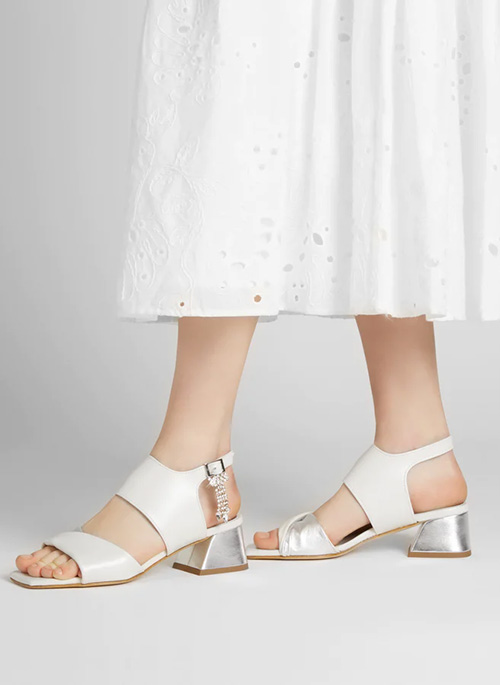 Want bridal shoes that have a little something extra? Search no further, the Rafu sandals are what you need. Made with white and silver leathers, the ankle straps are decorated with crystal buckle pendants. These jewels are handmade and give the right amount of sparkle. Wear these open-toe shoes with a long or midi wedding gown. Their low-mid block heel make them comfortable to wear for hours on end.