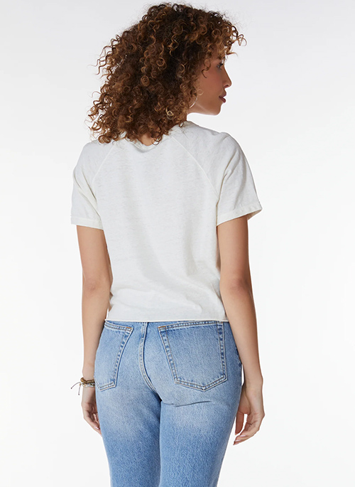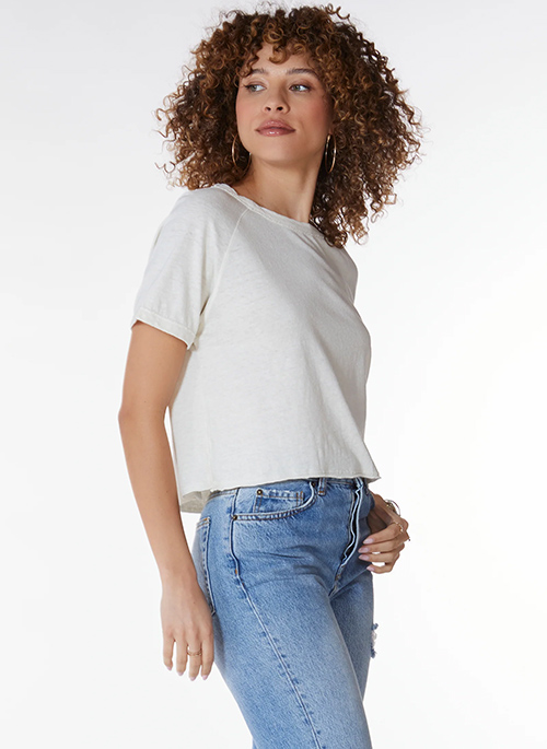 This light weight, cropped tee adds a hint of cool to any closet. Raglan style tee featuring cuffed cap sleeves, crew neckline, and a raw edge hem. Wear it with your favorite denim.
