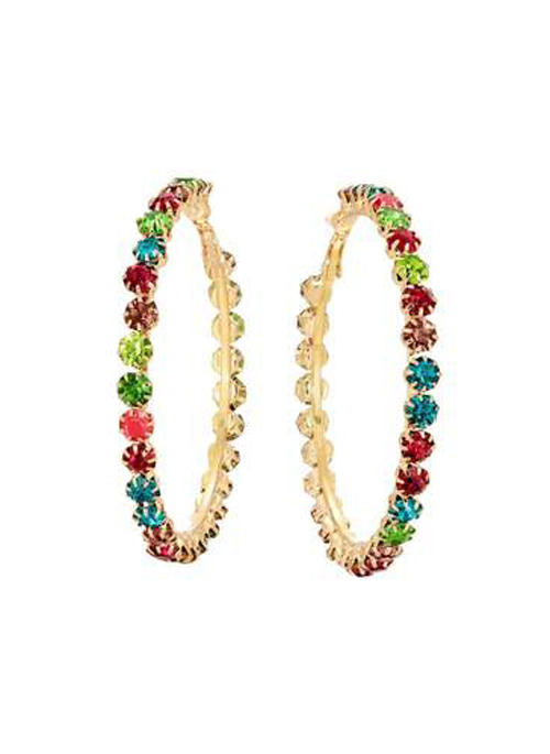 These fun, flirty hoops are the perfect addition to add a little bit of flair to your day! Lightweight and funky, these hoop earrings are constructed from gold plated alloy with assorted prong-set gem hued rhinestones. These earrings are a fun colorful take on a classic style with just a little touch of fab and a whole lot of fun. Perfect for fabulizing any summer outfit, the compliments will be endless!